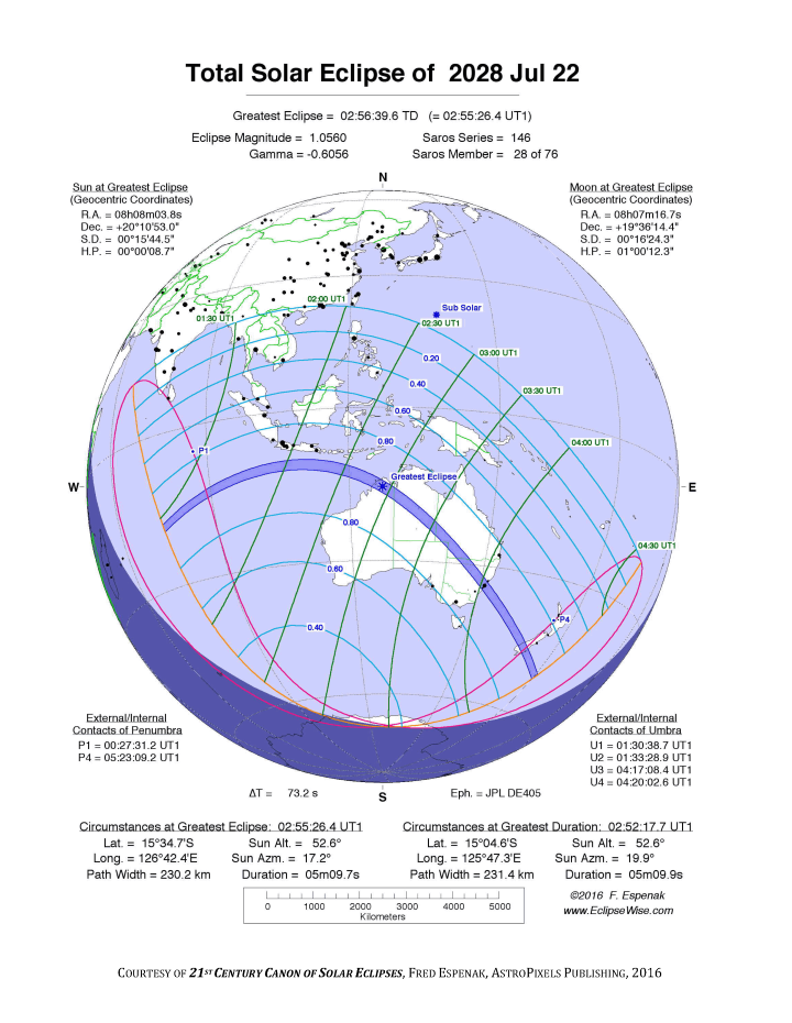Greatest Totality (560Km SW Darwin) 02:55:26 UT1 12:55:26 AEST Duration: 5m 10s