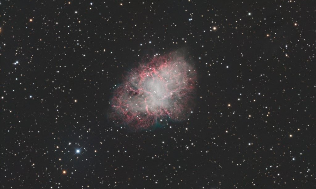 M1, also known as the Crab Nebula (Tadpoles nebula), is a fascinating celestial object (Supernova Remnant) with a rich history and complex structure 4.9 – 8.1 kly away. M1 is the remnant of a powerful supernova explosion that was observed and recorded by Chinese astronomers in 1054 AD. This explosion marked the death of a massive star. At the center of the Crab Nebula lies a rapidly spinning neutron star called a pulsar, a rapidly rotating neutron star. This pulsar emits powerful beams of radiation and particles, creating a “wind” that interacts with the surrounding nebula, shaping its structure and causing it to glow. The nebula’s name comes from its appearance through early telescopes, which reminded some observers of a crab’s pincers. It has a complex, filamentary structure composed of gas and dust ejected during the supernova explosion. These filaments are rich in elements like hydrogen, oxygen, and sulfur making it glow in various colors (different elements emit different colors of light) due to the interaction of the pulsar’s wind with the surrounding material.