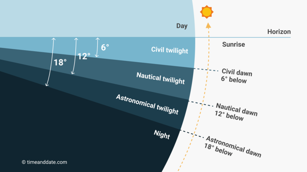 Before astronomical dawn and after astronomical dusk, it is astronomical nighttime, when no indirect sunlight is visible, and even faint celestial objects can be seen, weather permitting.